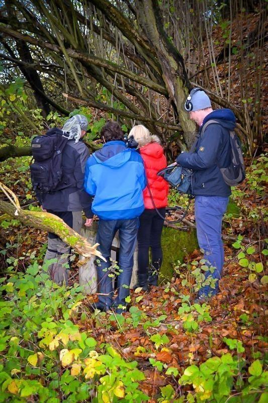 Kamera filmt zwei Personen, die im Unterholz etwas untersuchen