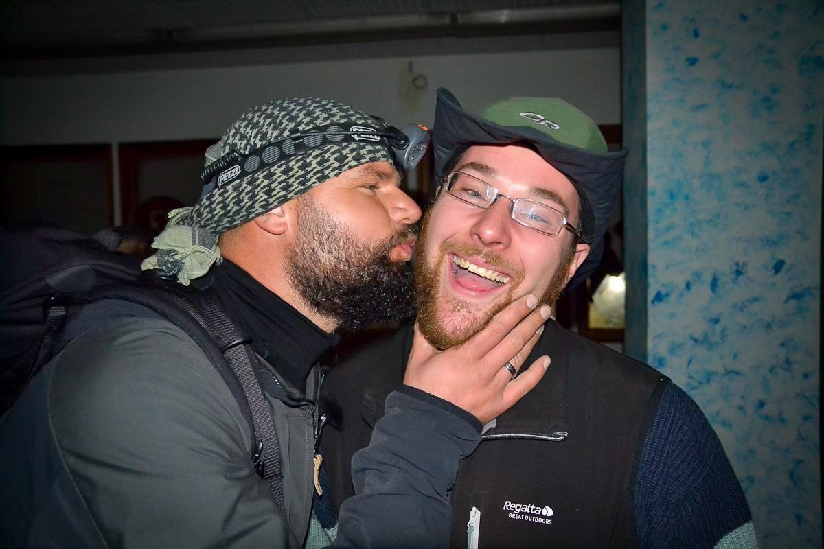 Zwei Männer lachen und posieren eng beieinander in einem Innenraum