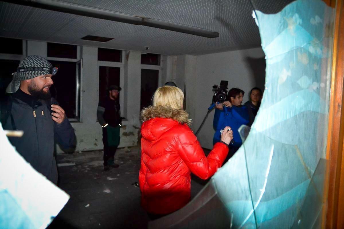 Zwei Personen in einem Raum mit zerbrochenem Fenster, eine filmt mit einer Kamera