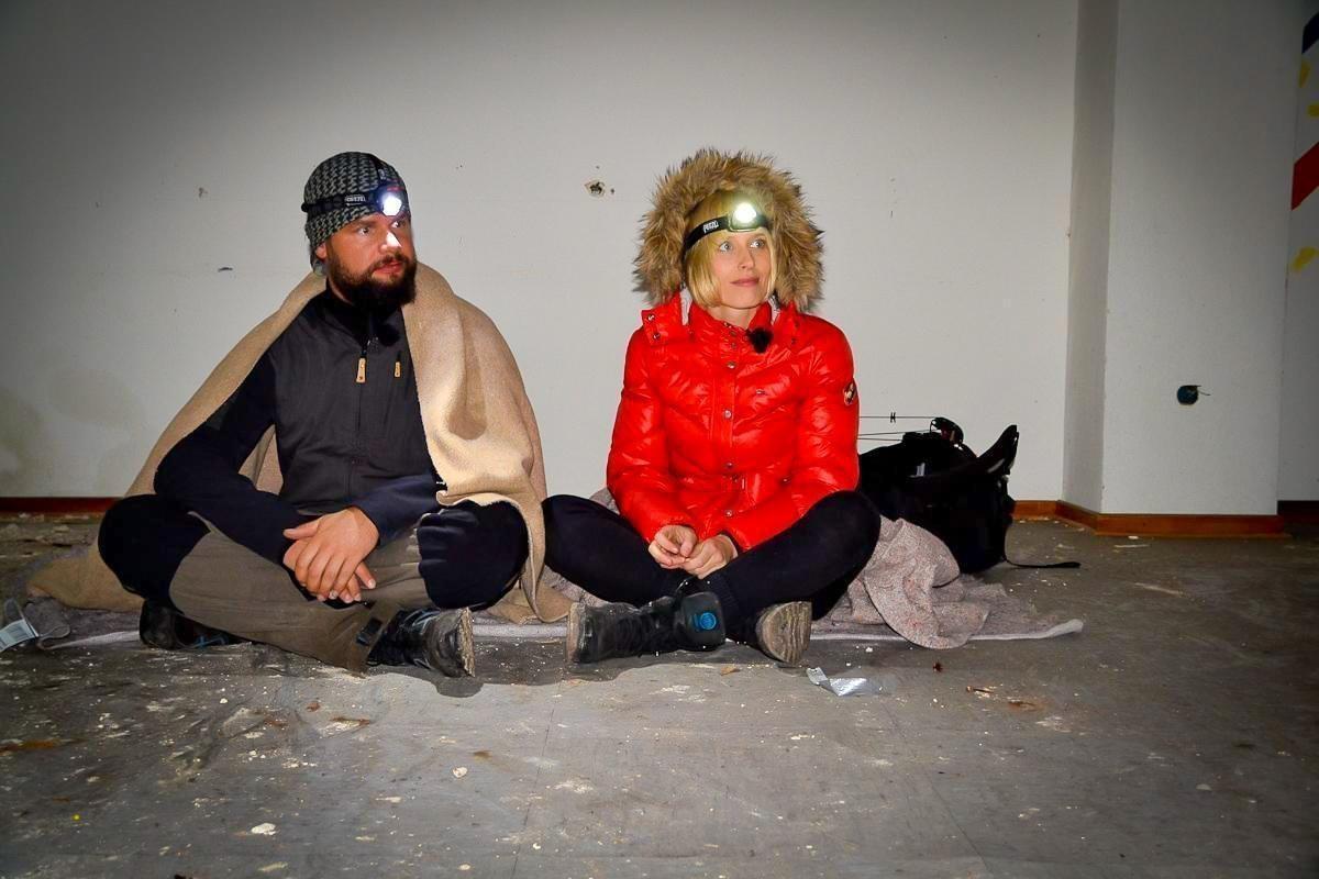 Zwei Personen sitzen auf dem Boden in einem leeren Raum und tragen Stirnlampen