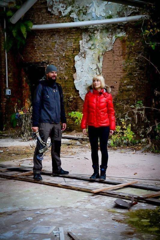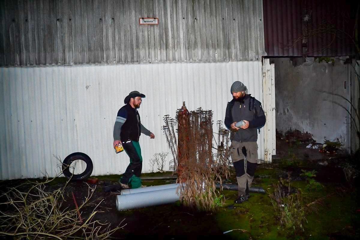 Zwei Personen stehen in einer verlassenen Umgebung und untersuchen Materialien