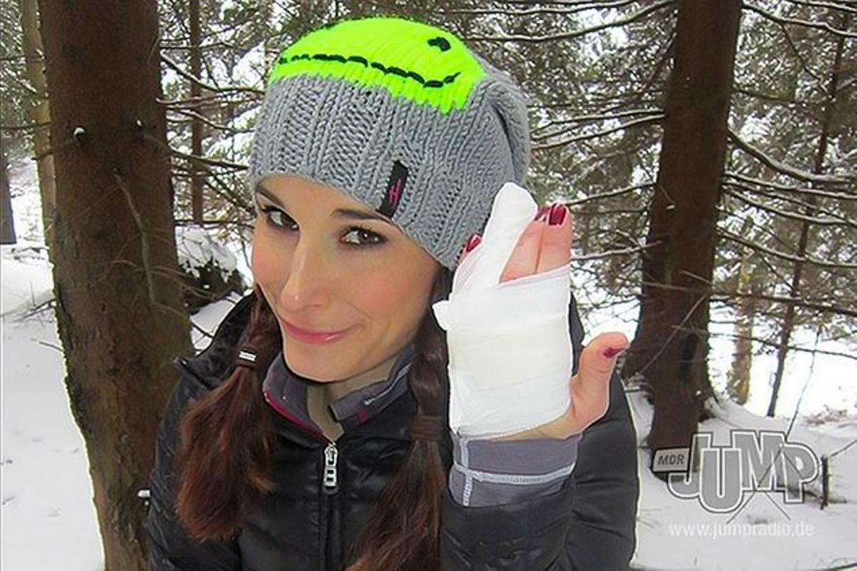 Eine Person mit einer grauen Mütze und verbundenem Handgelenk lächelt in einem Wald