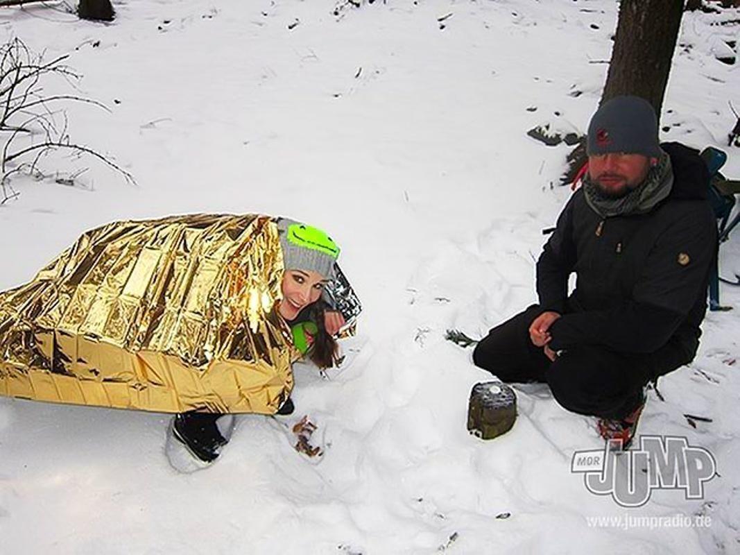 Frau hält eine reflektierende Notdecke, Mann beobachtet im Schnee zwischen Bäumen