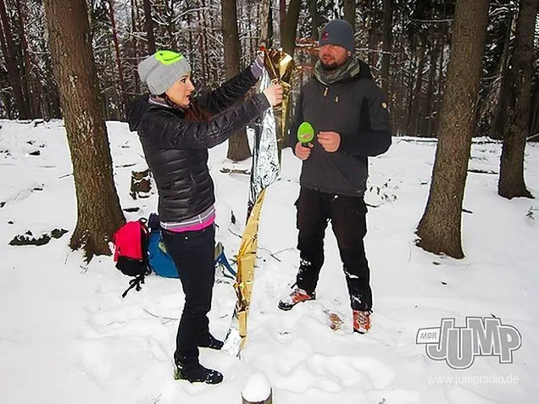 Frau hält eine reflektierende Notdecke, Mann beobachtet im Schnee zwischen Bäumen Frau hält eine Tüte mit Zunder in der Hand, umgeben von schneebedeckten Bäumen