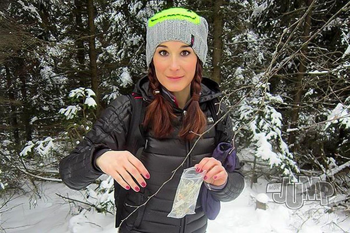 Frau hält eine Tüte mit Zunder in der Hand, umgeben von schneebedeckten Bäumen