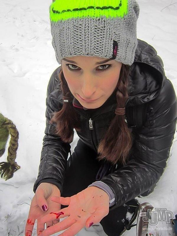 Hände mit Blutspuren in der Schneelandschaft, Person schaut direkt in die Kamera