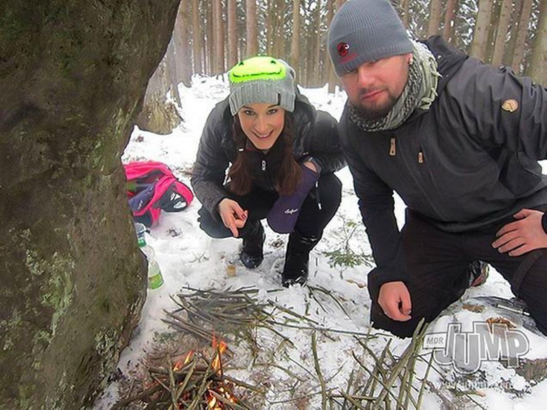 Kleine Flamme brennt zwischen Ästen im Schnee, zwei Personen knien daneben