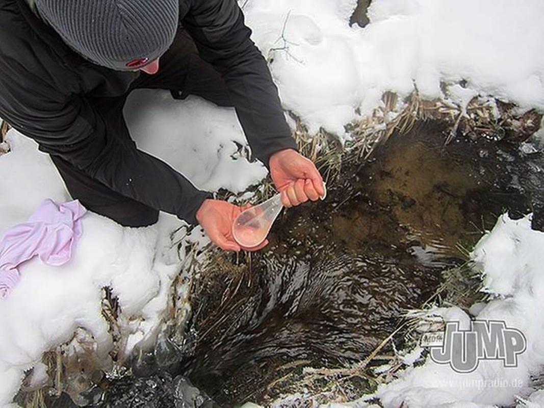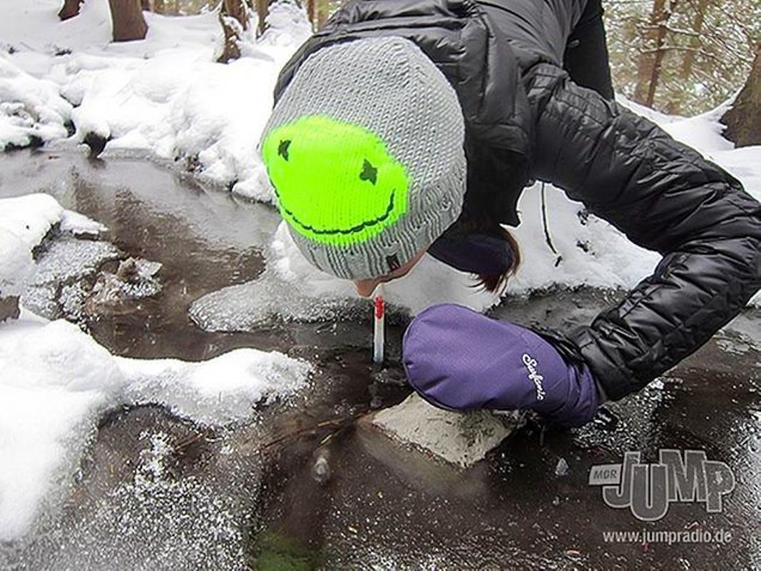 Person beugt sich über gefrorenes Wasser und nutzt einen Stift zur Messung