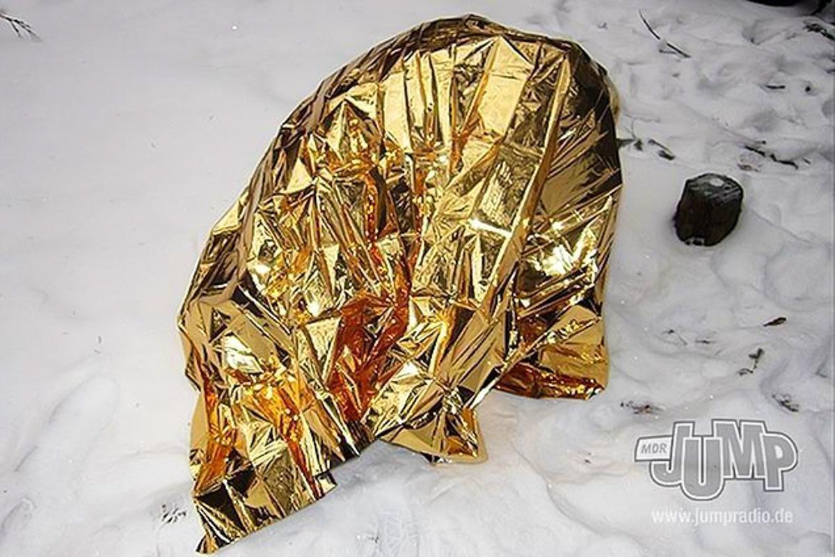 Folie-Notunterkunft schützt vor Kälte, während ein Mann neben einem Kocher sitzt