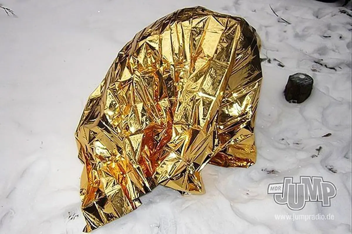 Zwei Personen bereiten Zunder aus Ästen für ein Feuer im Schnee vor Zwei Personen halten eine reflektierende Rettungsdecke in einem verschneiten Wald