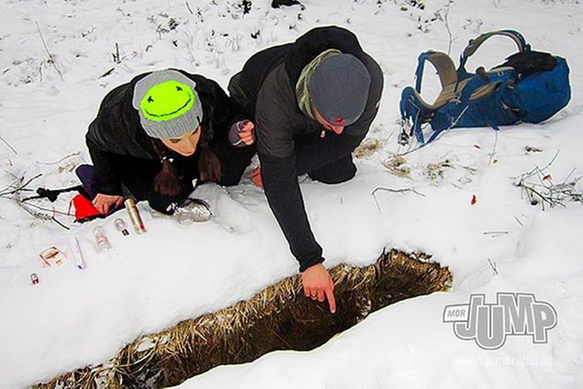 Zwei Personen knien im Schnee und betrachten eine Öffnung im Boden