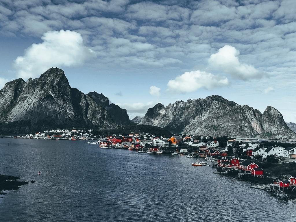 Bergige Küstenlandschaft mit bunten Häusern am Wasser und bewölktem Himmel