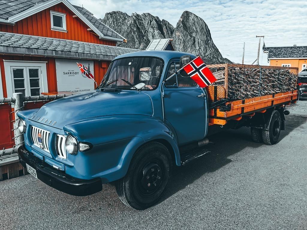 Blauer Lkw mit Holzladung und norwegischer Flagge vor einem Holzhaus