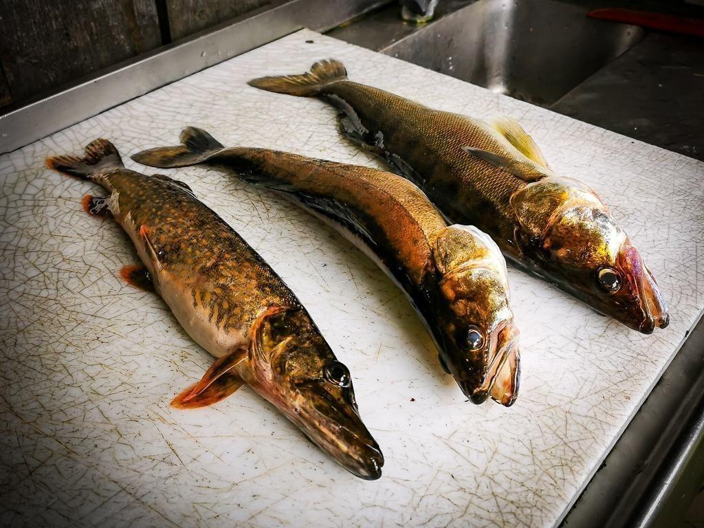 Drei gefangene Fische liegen auf einem Schneidebrett in einer Küche