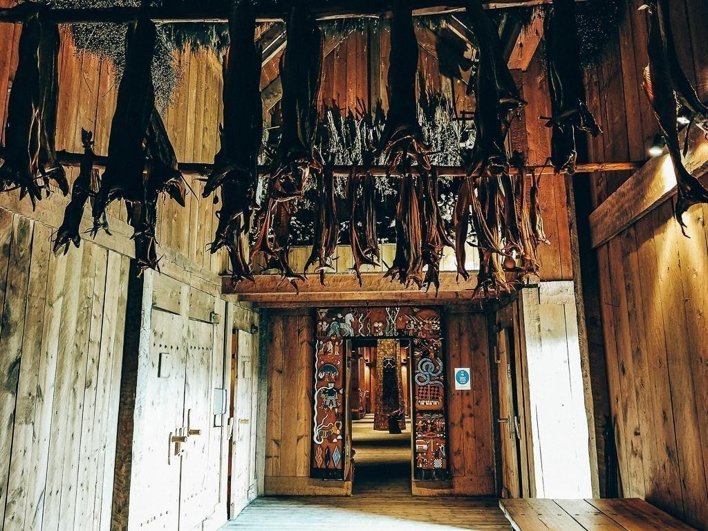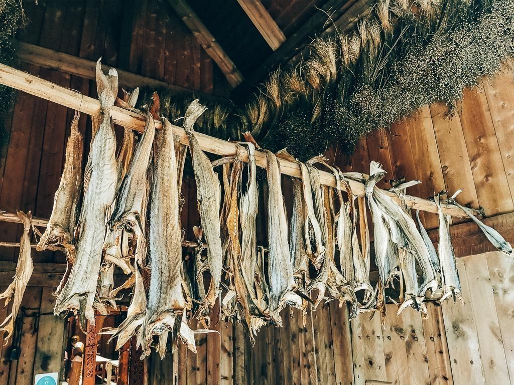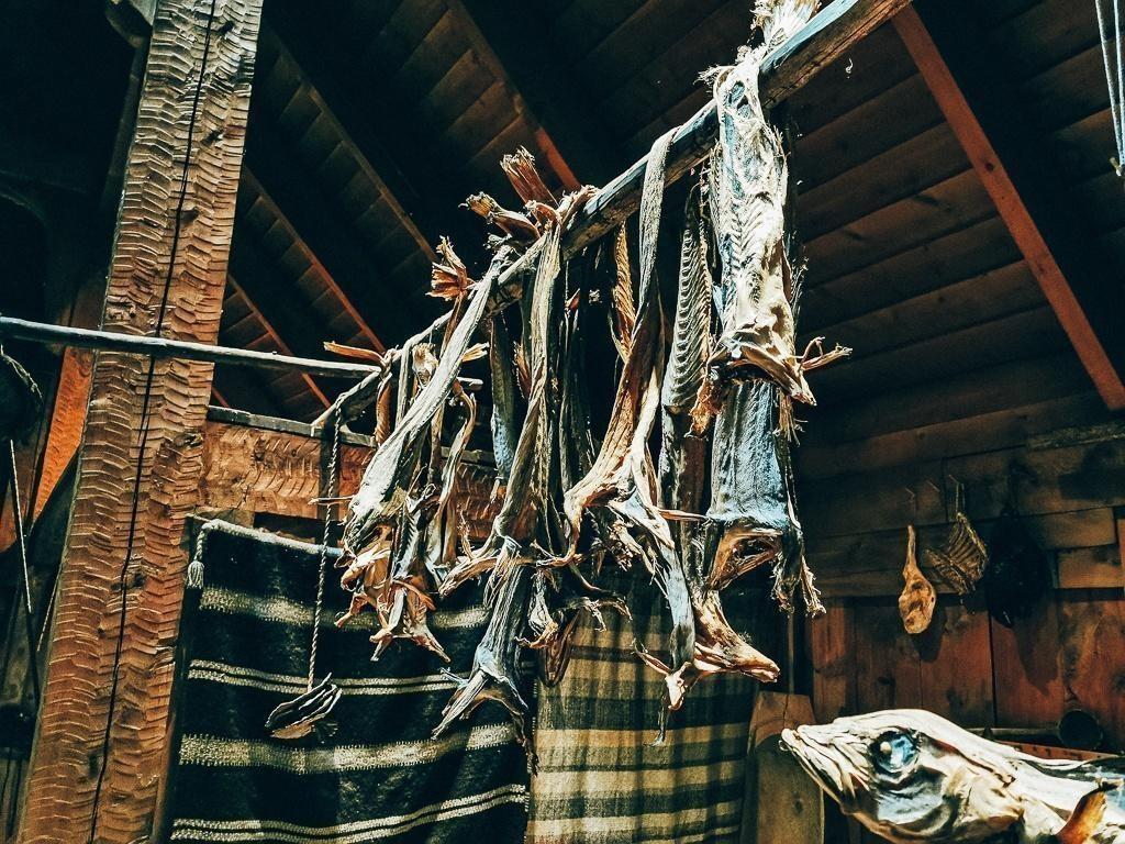 Trockenfisch hängt an einem Balken, umgeben von Decken und Holzstrukturen