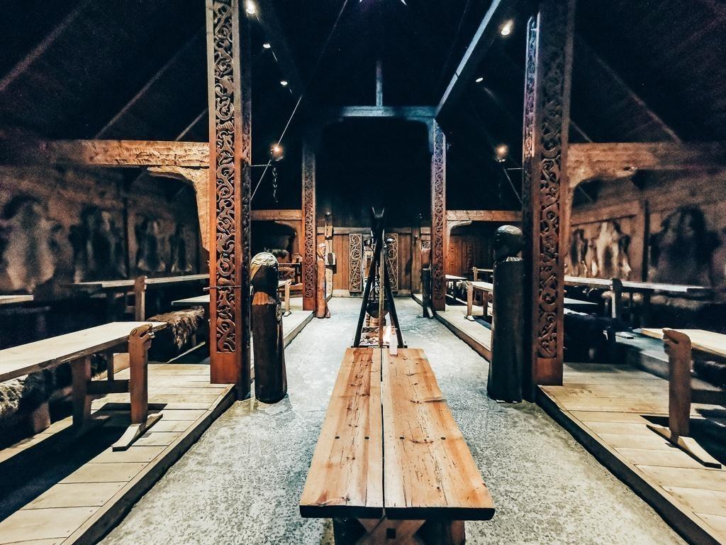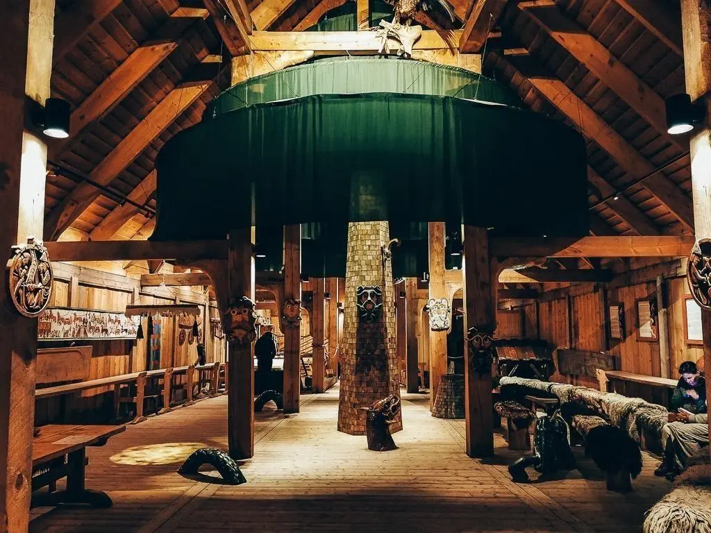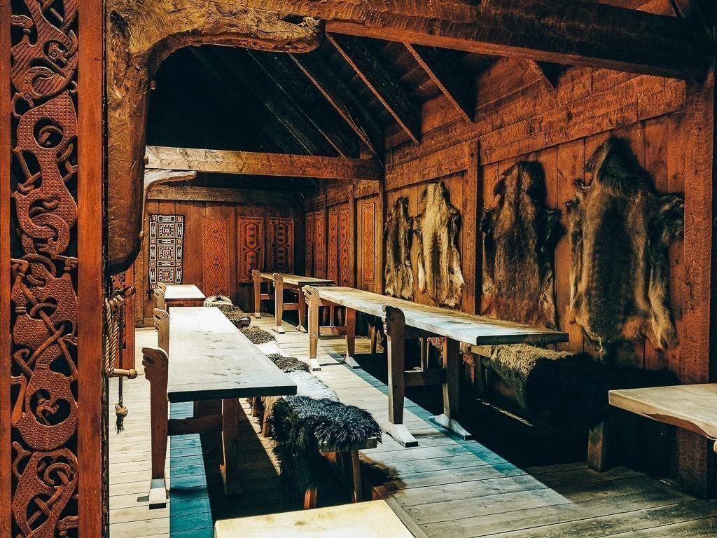 Holzverkleideter Raum mit langen Tischen und Tierfellen an den Wänden