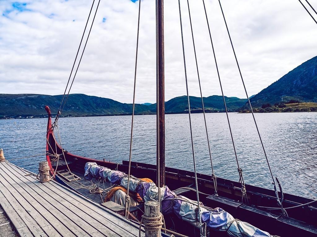 Schiff mit Drachenkopf auf Wasseroberfläche vor hügeliger Landschaft