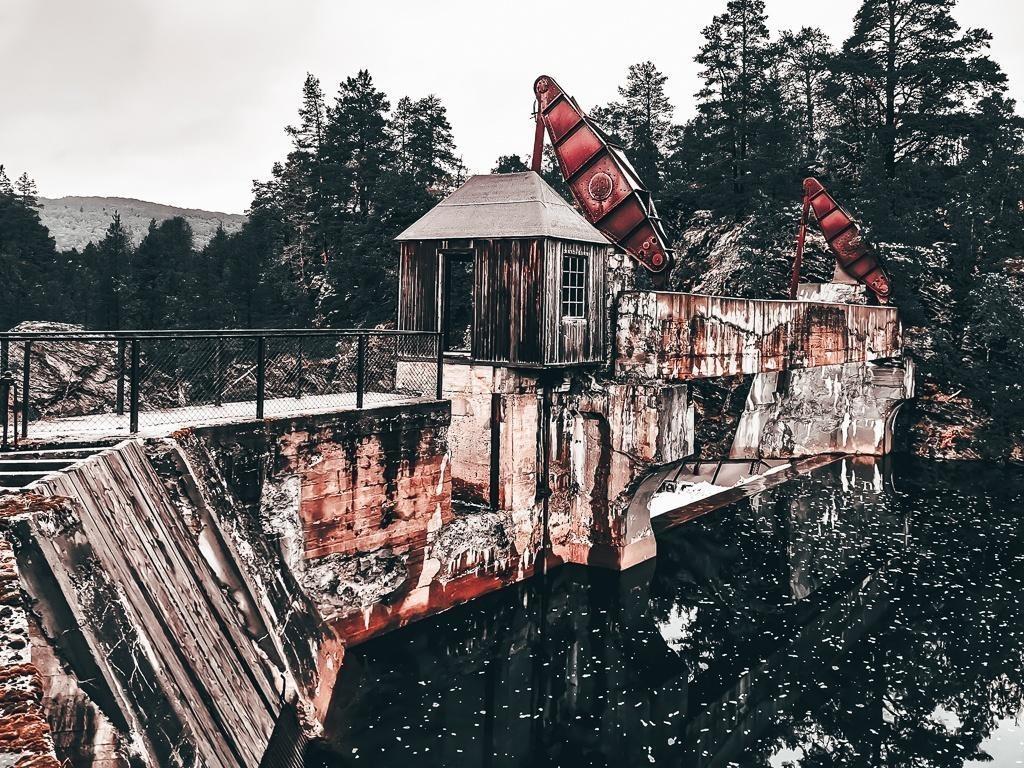 Holzgebäude an einer Wasserbarriere mit zwei roten Klappen und umgebenden Bäumen
