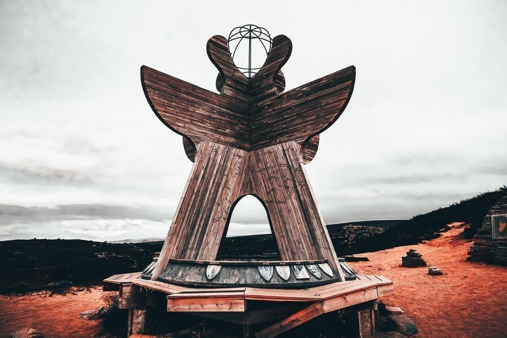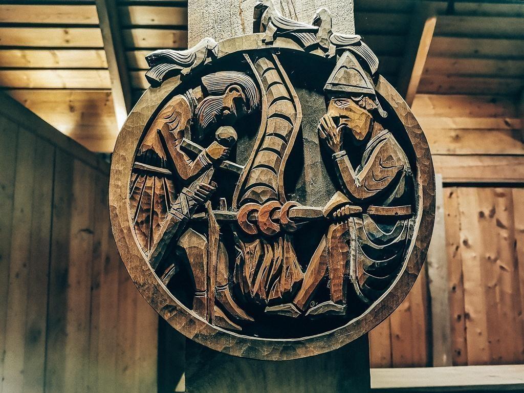 Holzskulptur mit geschnitztem Gesicht und keltischem Symbol im Hintergrund