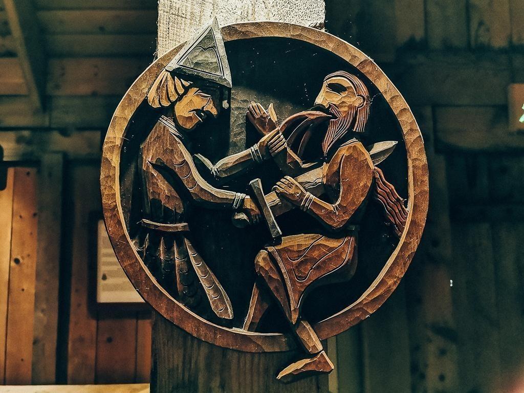 Holzrelief zeigt zwei kämpfende Figuren mit Schwertern in einer runden Umrandung