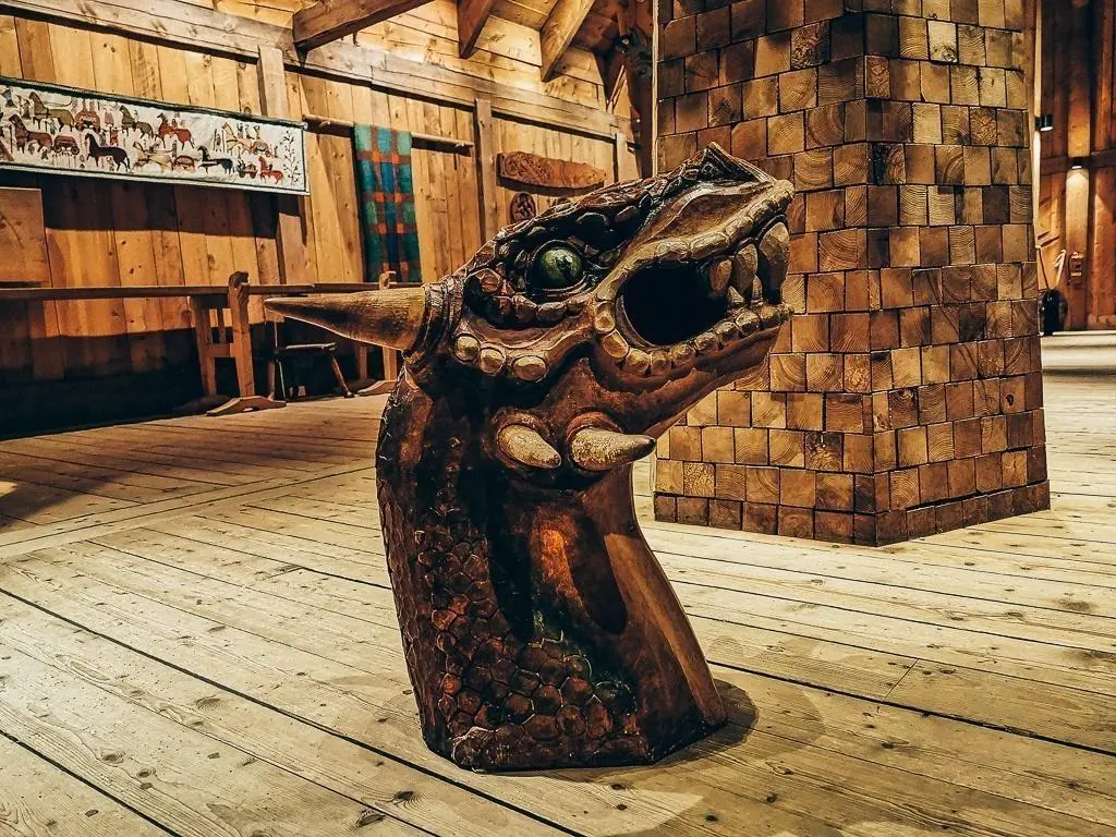 Holzskulptur eines Drachenkopfes steht auf dem Boden in einem Holzgebäude