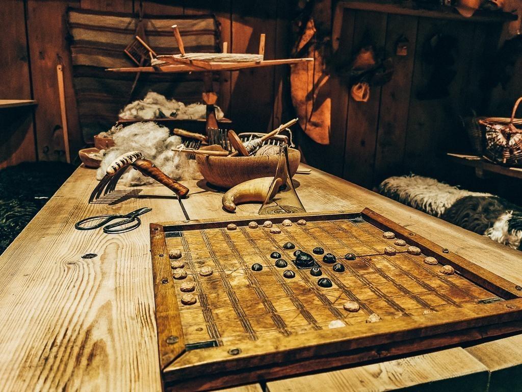 Holztisch mit einem Brettspiel, Spielsteinen und verschiedenen Werkzeugen