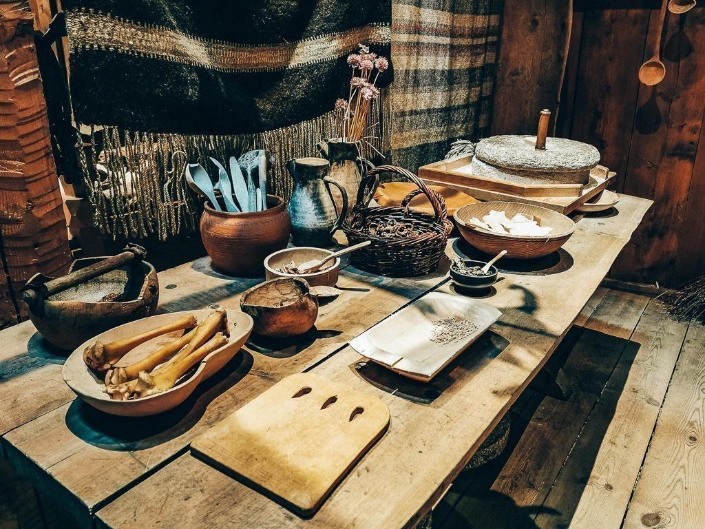 Holztisch mit verschiedenen Töpfen, Geschirr und Küchenutensilien in rustikalem Ambiente