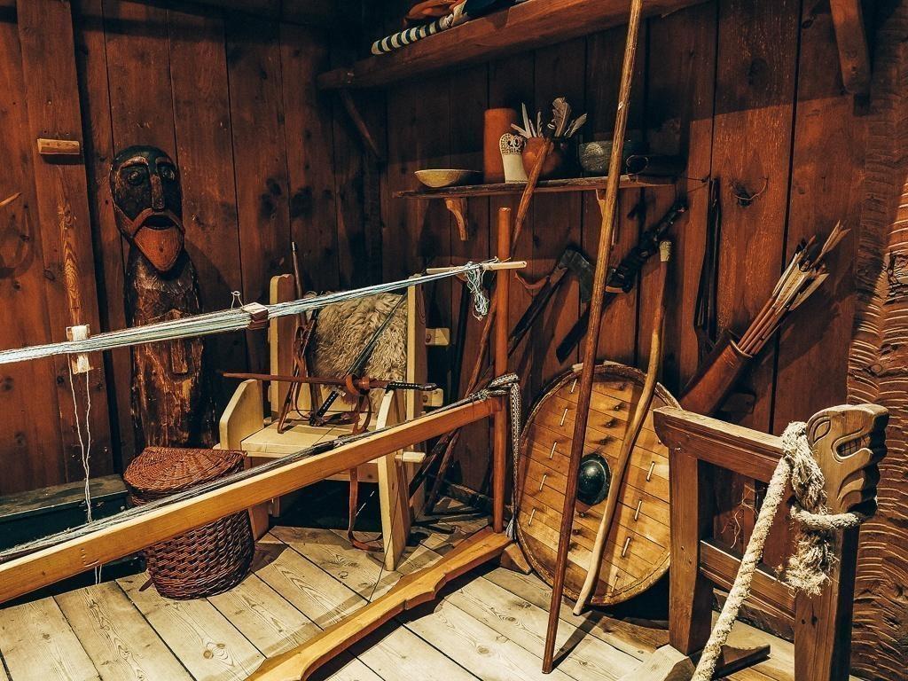 Wand mit verschiedenen Holzwerkzeugen und Speeren in einer rustikalen Umgebung
