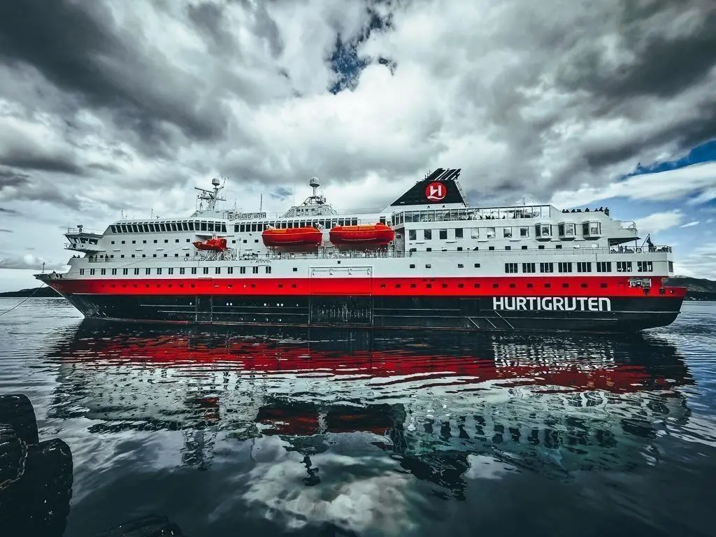 Kreuzfahrtschiff mit rotem und weißem Rumpf spiegelt sich im Wasser unter bewölktem Himmel