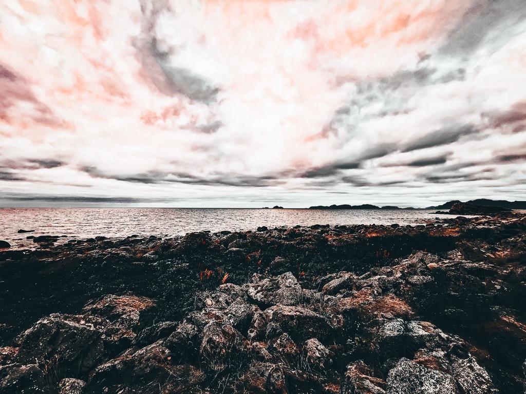 Küstenlandschaft mit Felsen und bewölktem Himmel über dem Meer