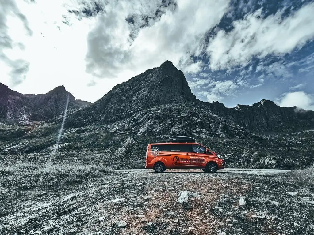 Oranger Van steht auf einer Straße vor einer bergigen Landschaft mit Wolken
