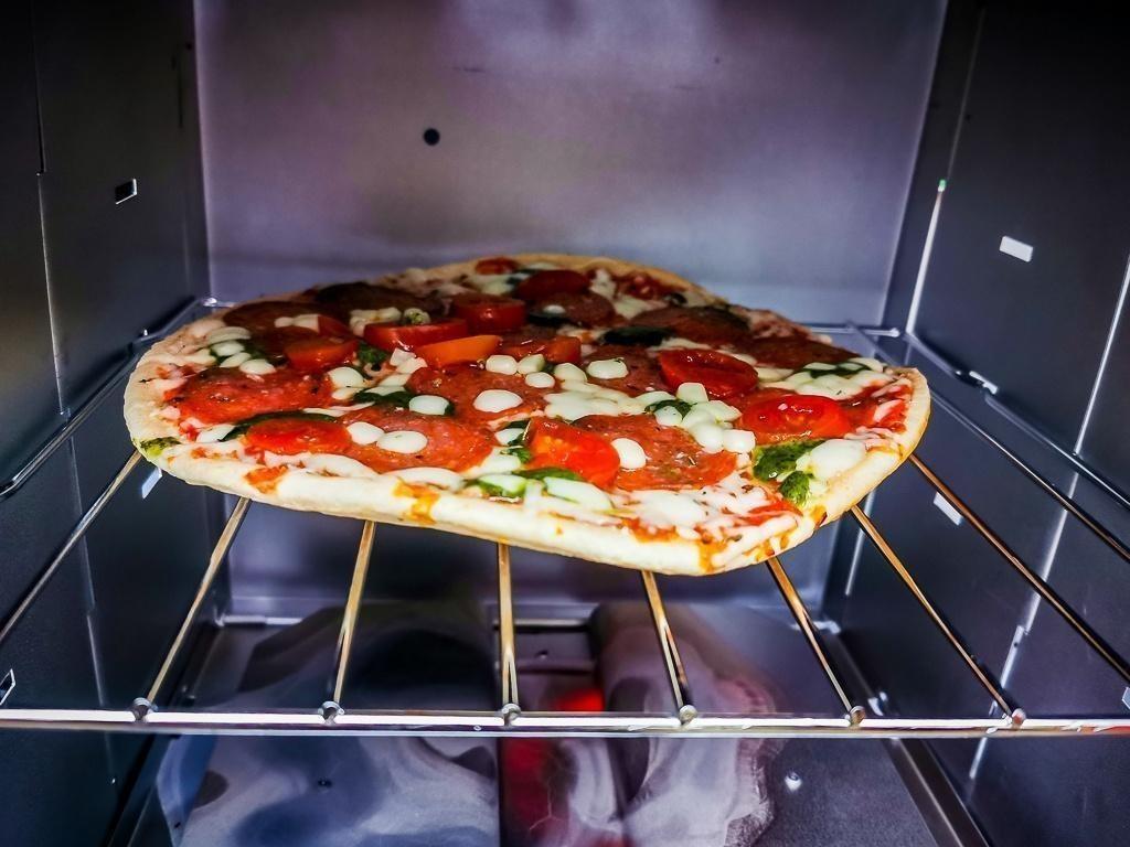 Pizza liegt auf einem Gitterrost in einem Ofen