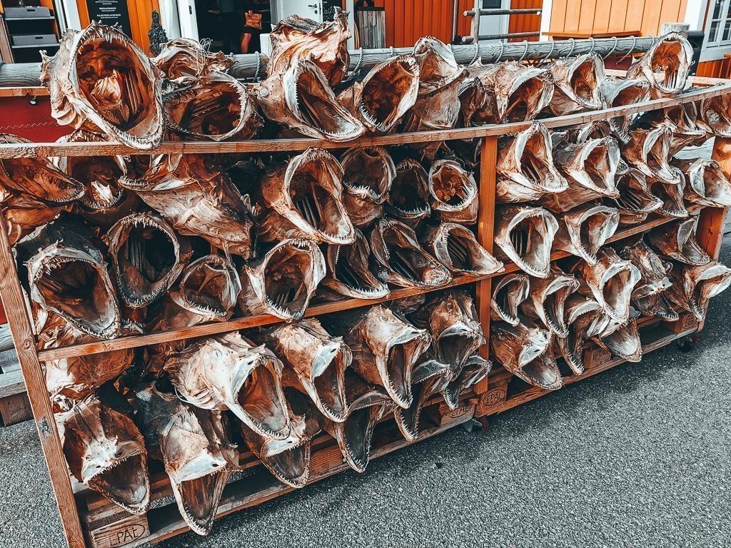 Regal mit mehreren Fischschädeln, die aufrecht angeordnet sind