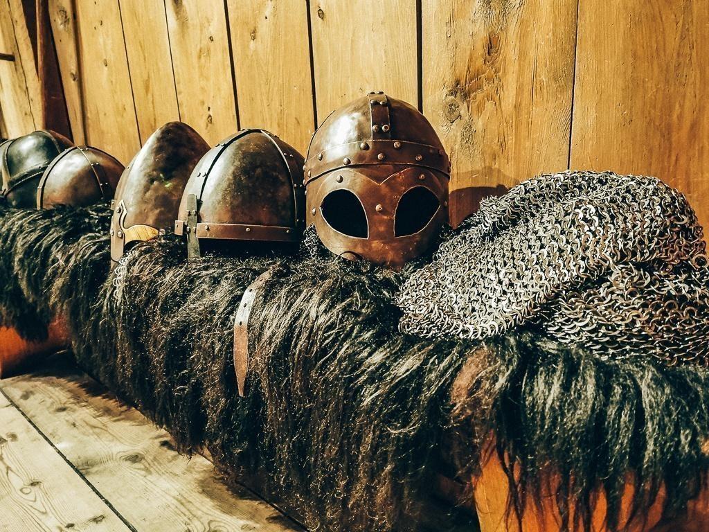 Reihe von Rüstungen und Helmen auf einem Fell über einer Holzbank