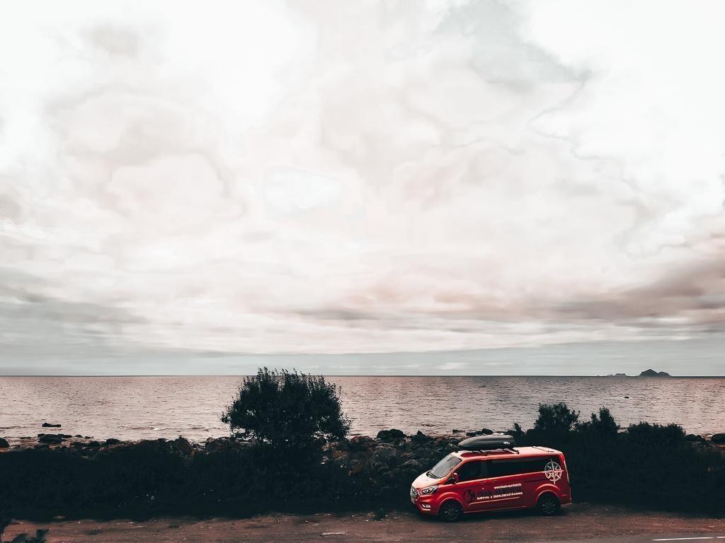 Roter Van parkt am Ufer mit Blick auf das Meer und bewölkten Himmel