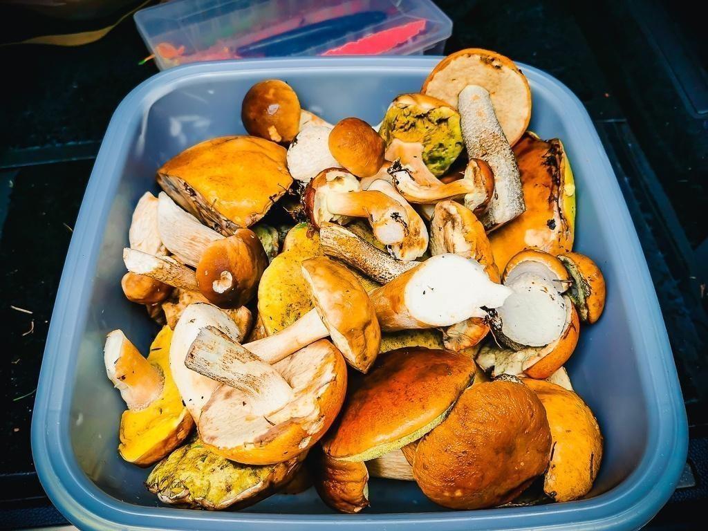 Schüssel mit verschiedenen gesammelten Pilzen in unterschiedlichen Farben und Formen