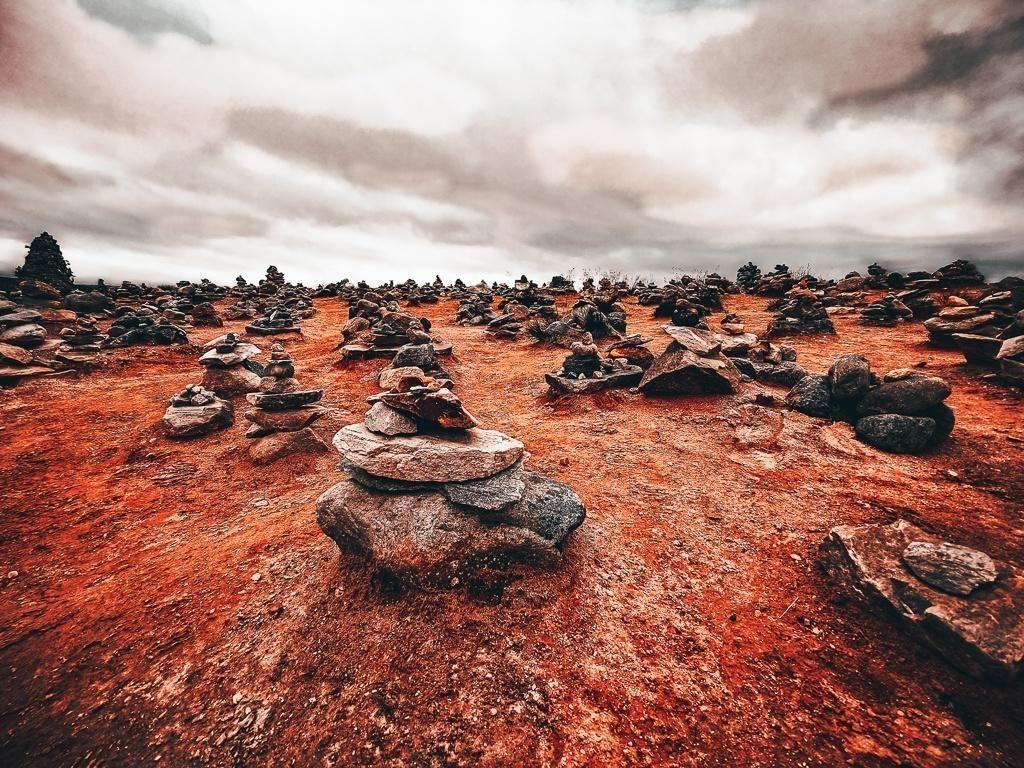 Steinansammlungen auf rotem Boden unter bewölktem Himmel