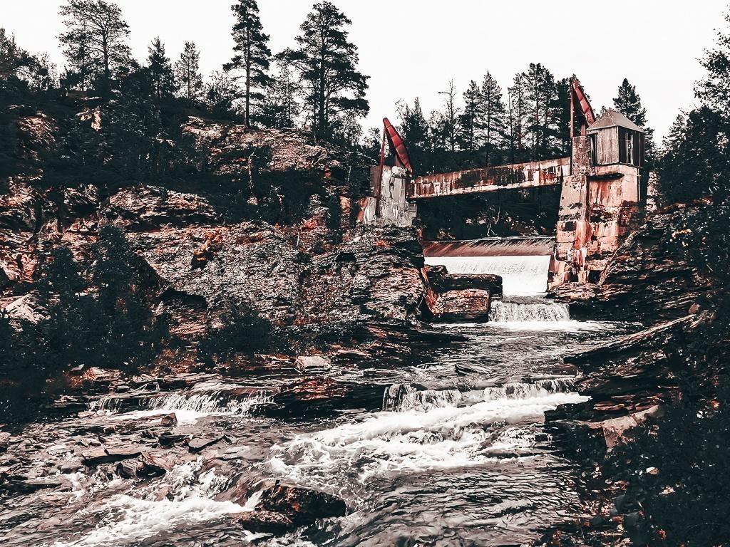 Stromschnellen fließen unter einer alten, verfallenen Staumauer hindurch