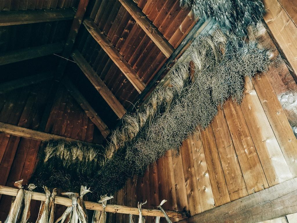Trockenes Kraut hängt an der Decke eines Holzgebäudes