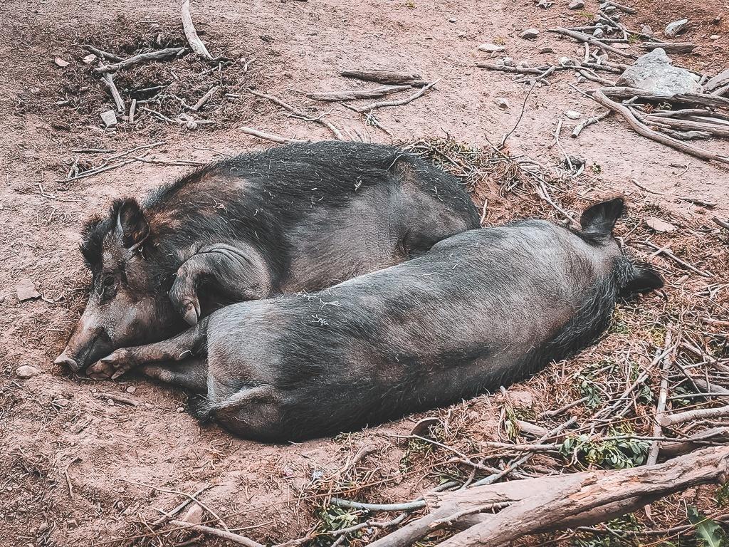 Zwei Wildschweine liegen eng umschlungen auf dem Boden