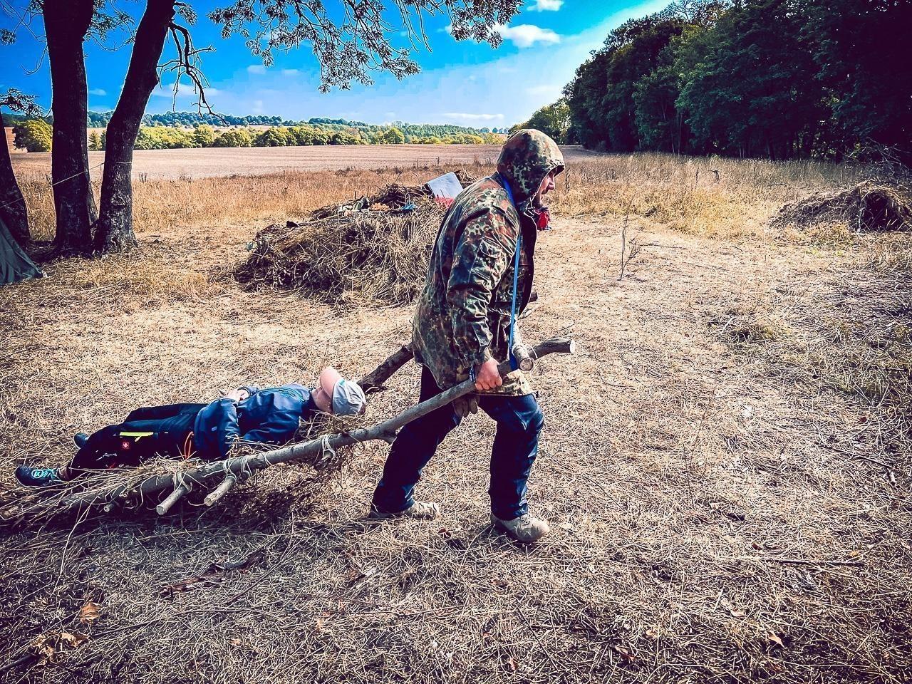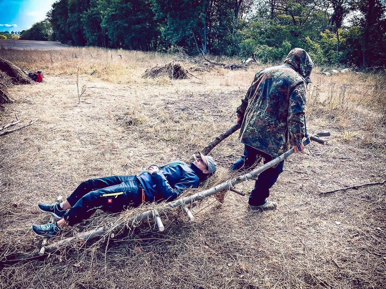 Eine improvisierte Trage aus Ästen transportiert eine Person über den Boden