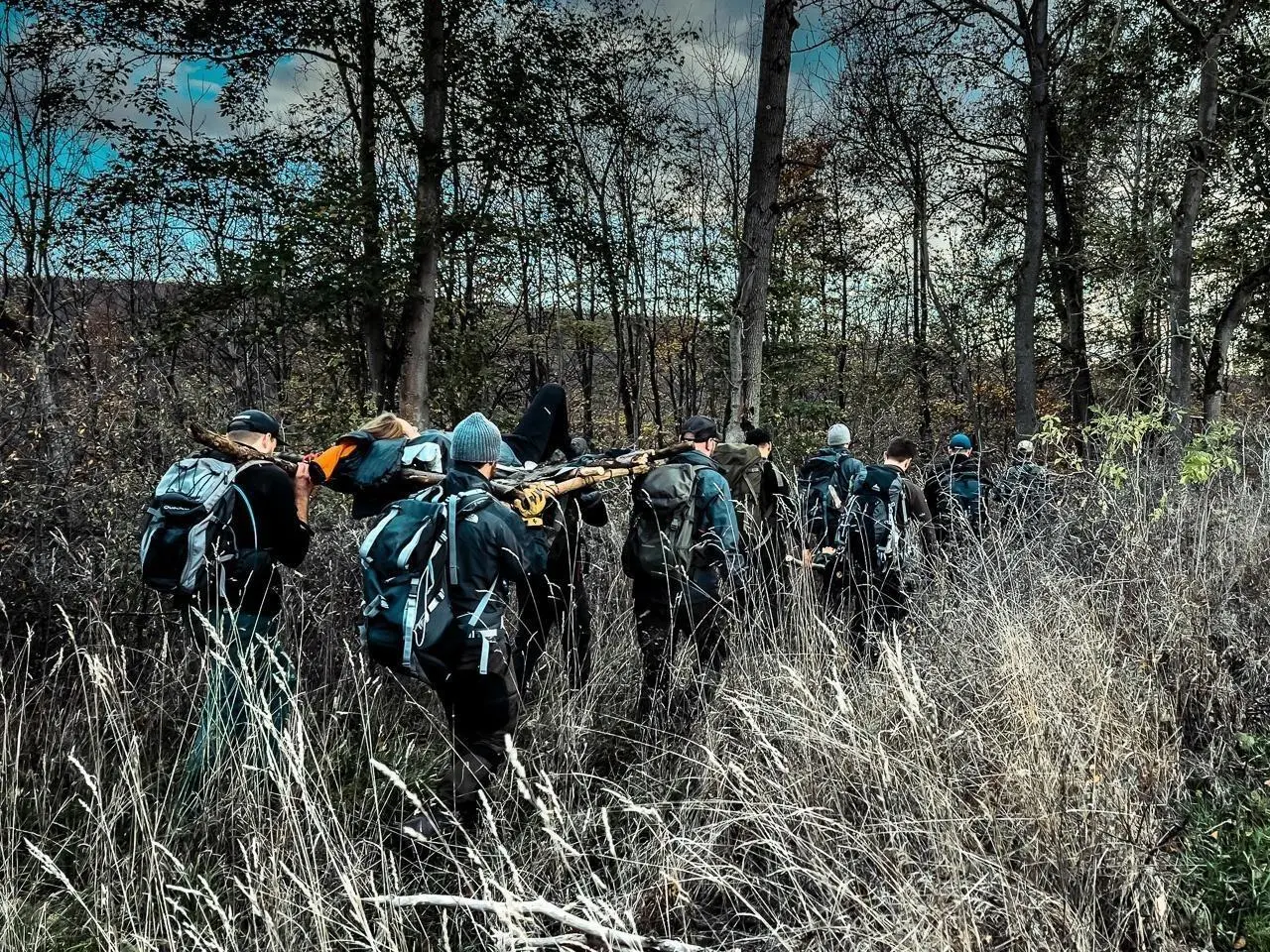 Gruppe trägt improvisierte Trage durch hohes Gras im Wald