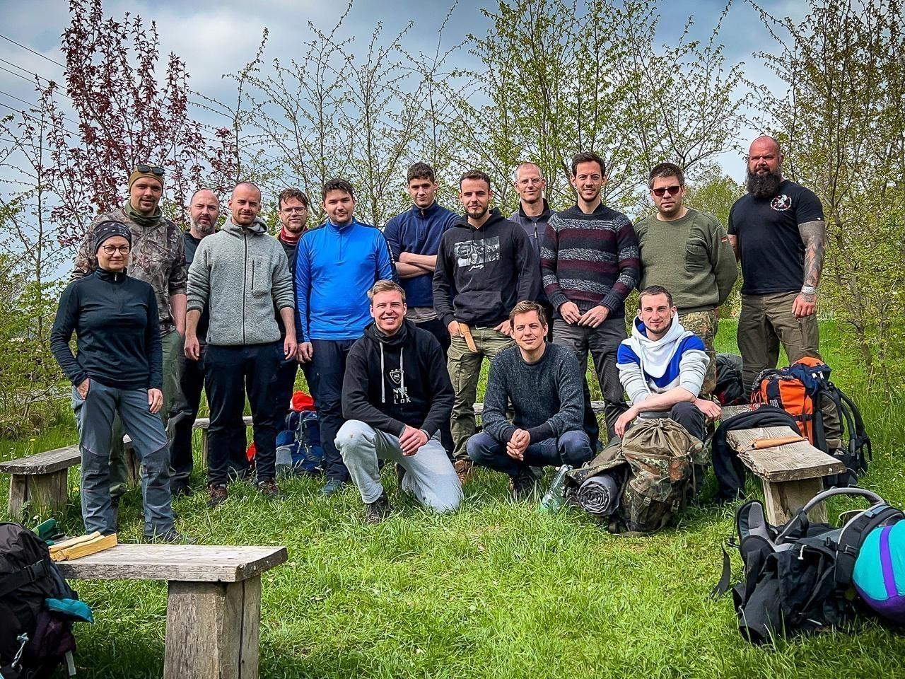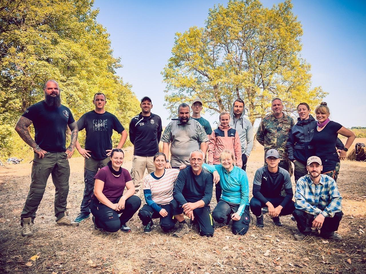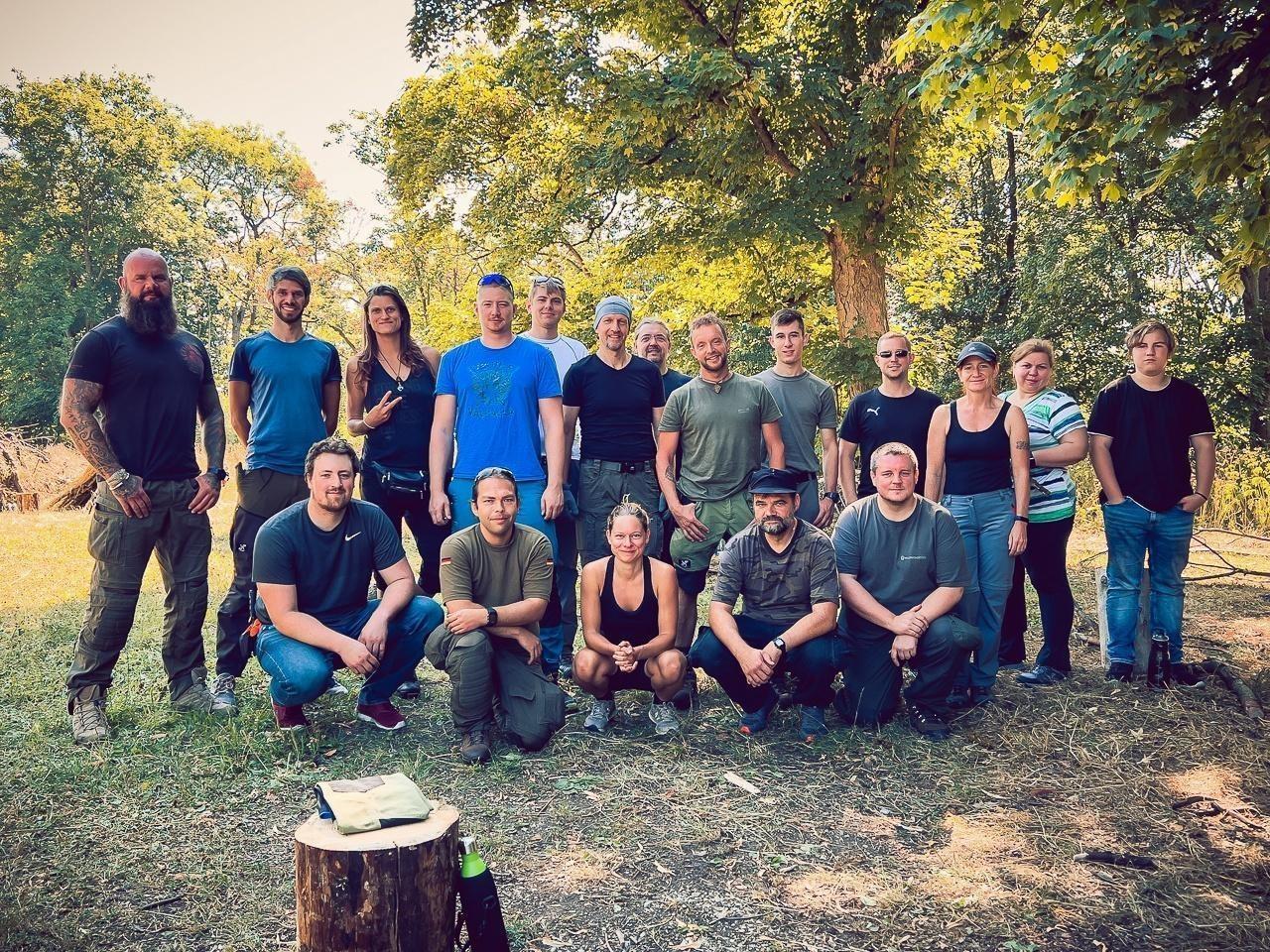 Gruppierung von Teilnehmern auf einer Wiese, umgeben von Bäumen und Natur