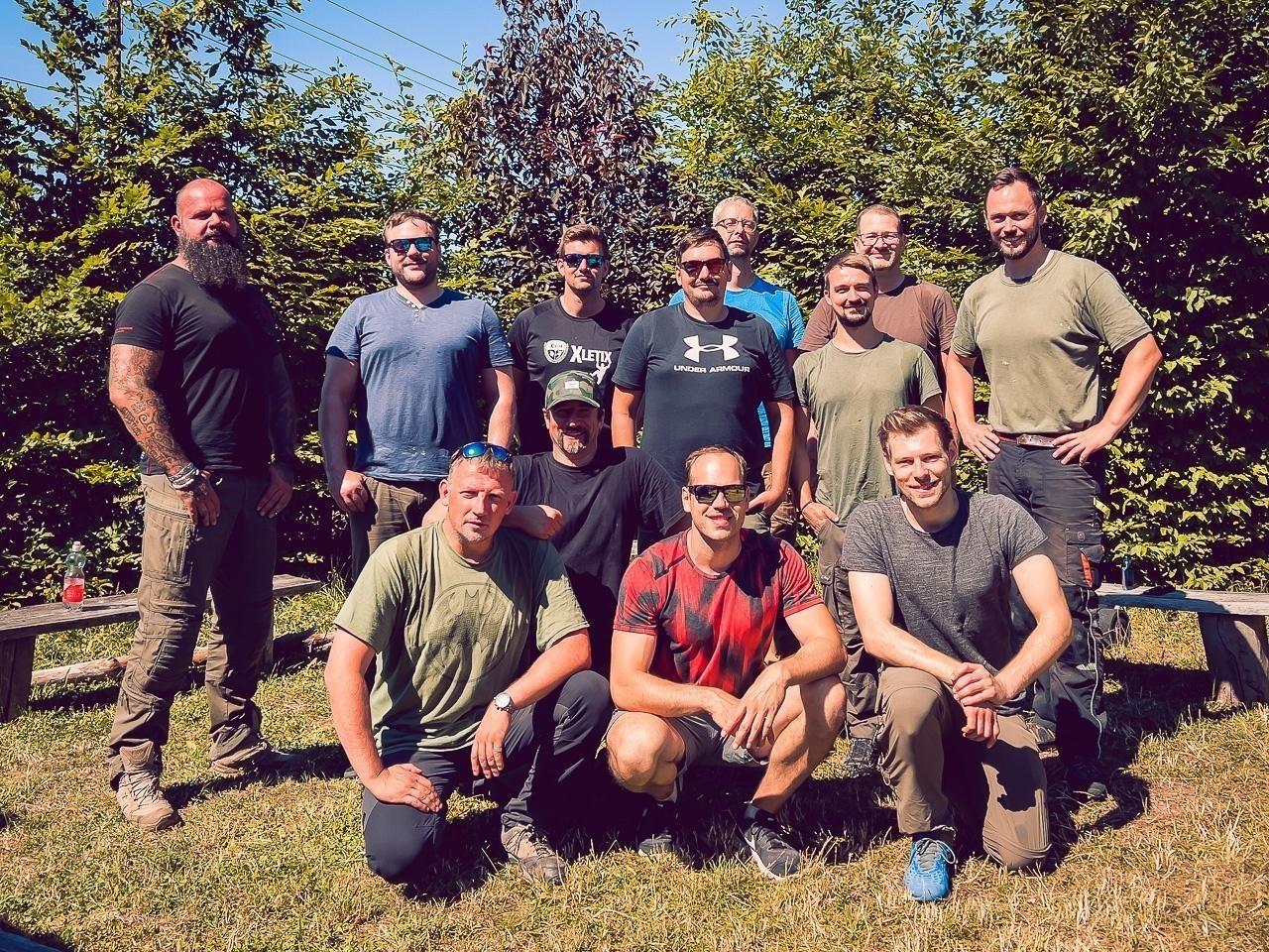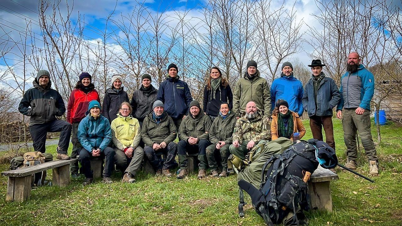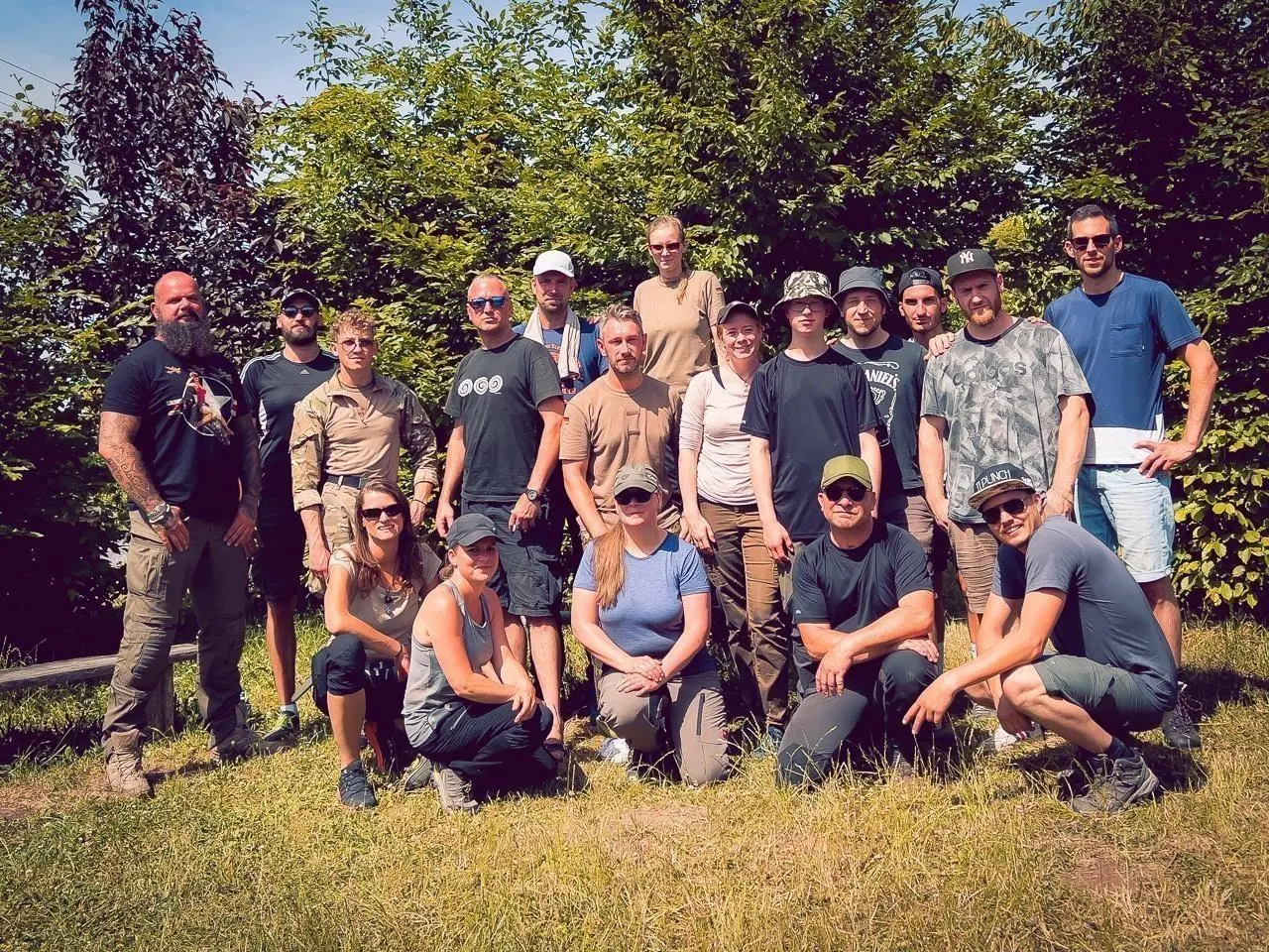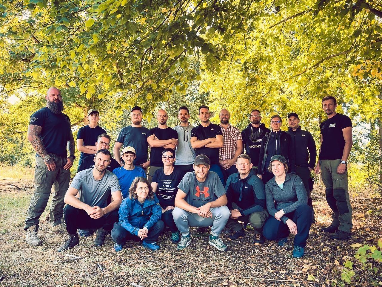 Gruppierung von Teilnehmern auf einer Wiese, umgeben von Bäumen und Natur