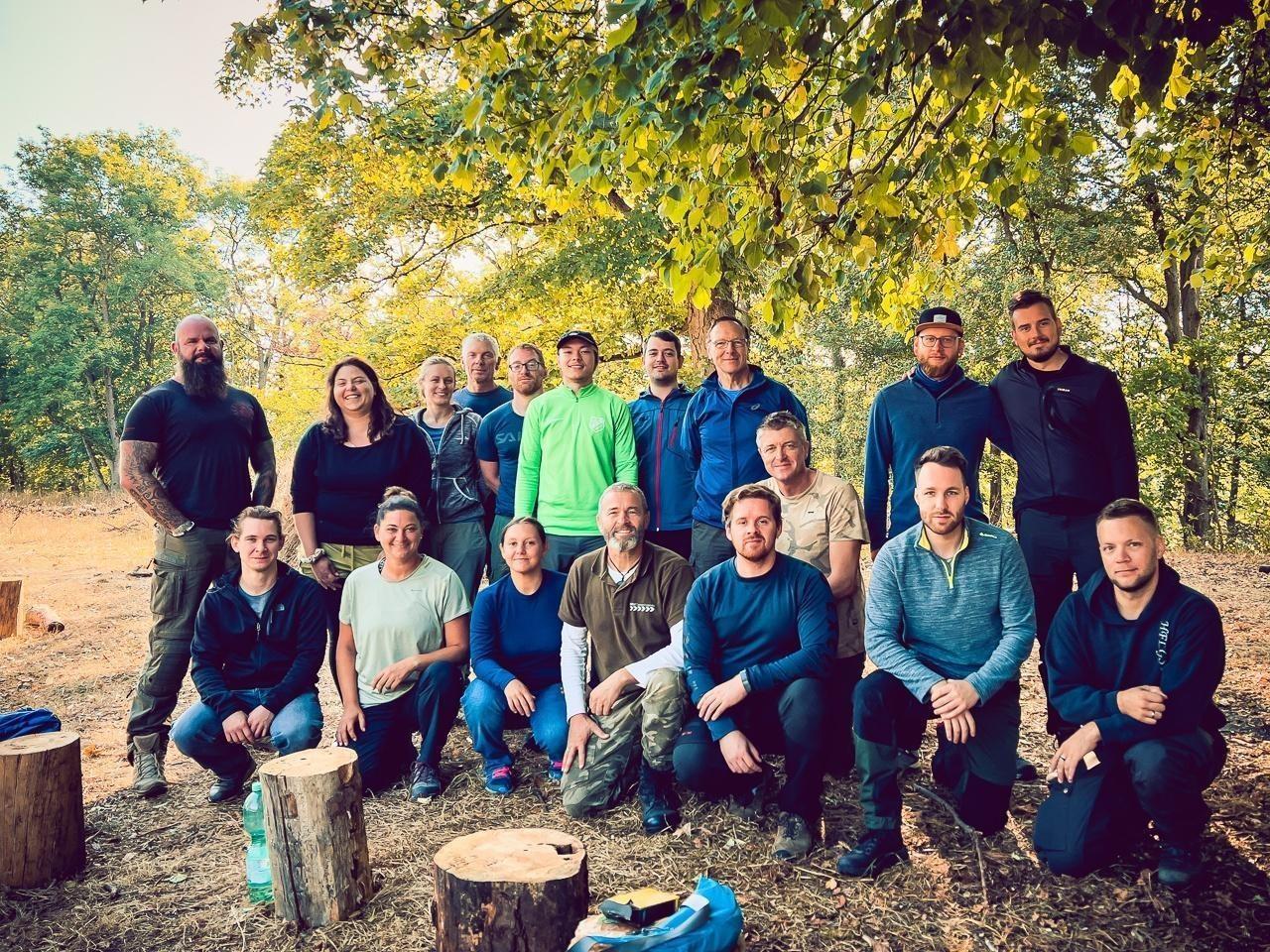 Gruppe von Teilnehmern in Outdoor-Bekleidung unter Bäumen im Wald