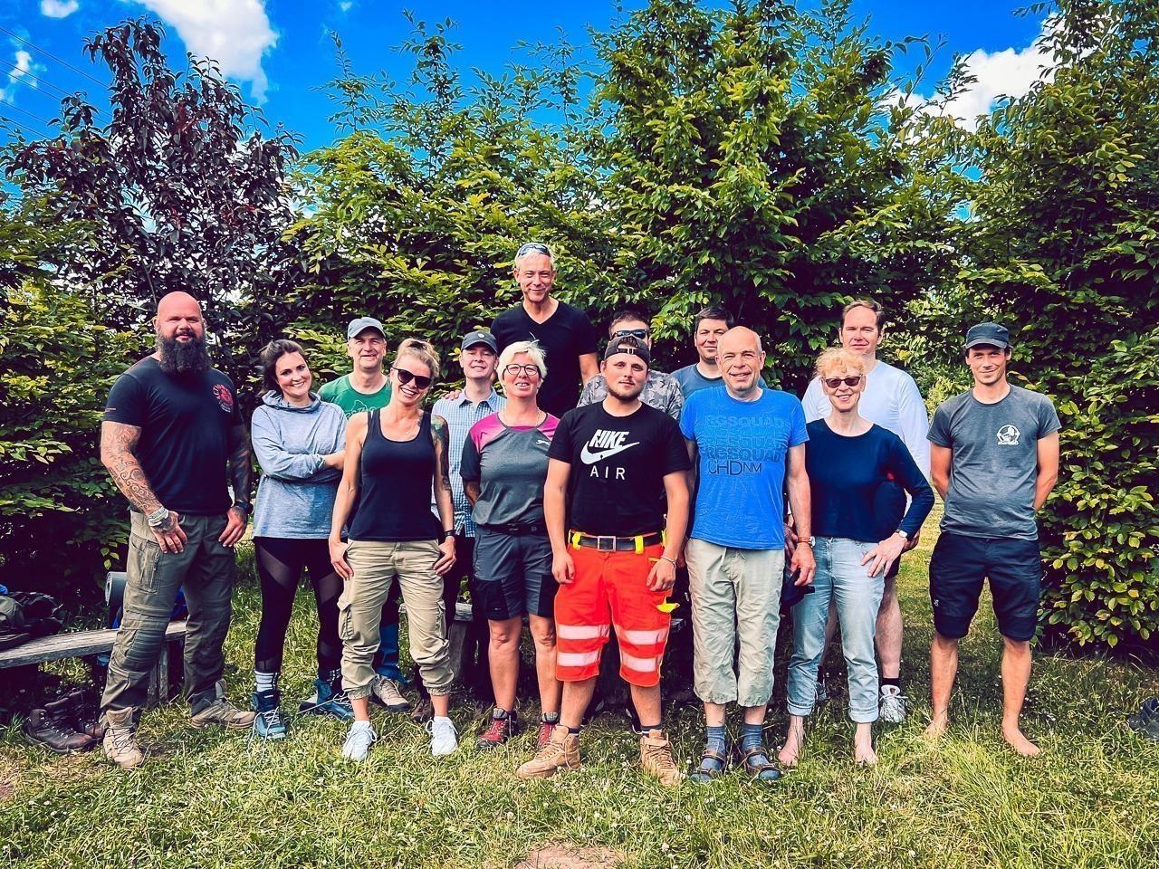 Gruppe von zehn Personen in Outdoor-Bekleidung steht auf einer Wiese vor Bäumen