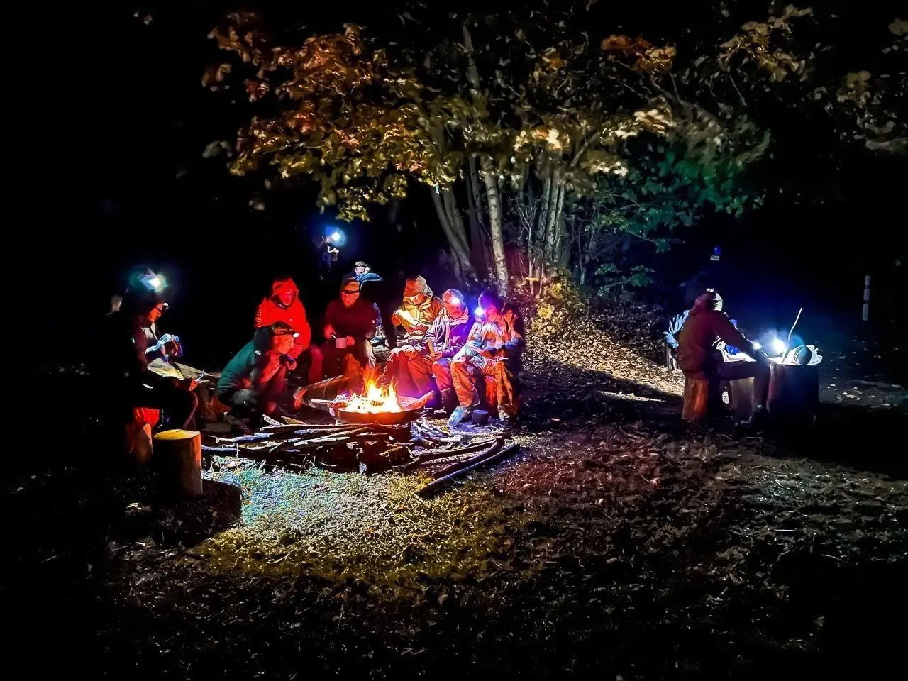 Lagerfeuer umringt von mehreren Personen in der Nacht, mit Stirnlampen beleuchtet