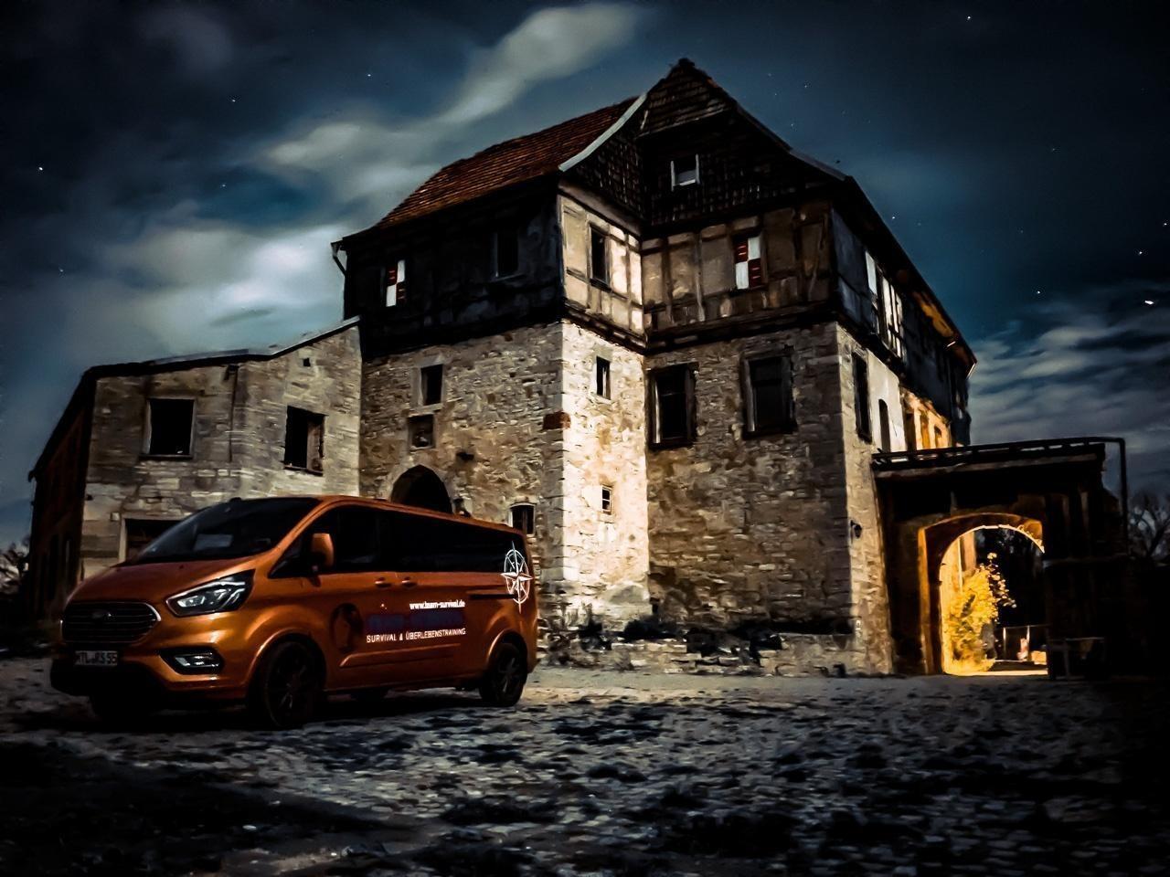 Oranger Transporter steht vor einem alten, steinernen Gebäude bei Nacht