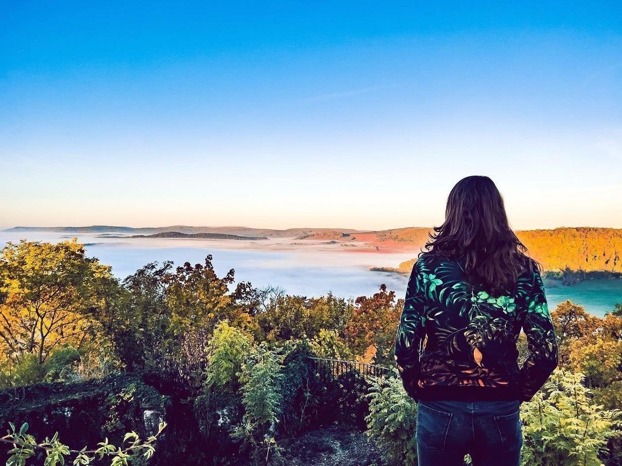 Person mit langem Haar betrachtet die Landschaft mit Nebel und Bäumen