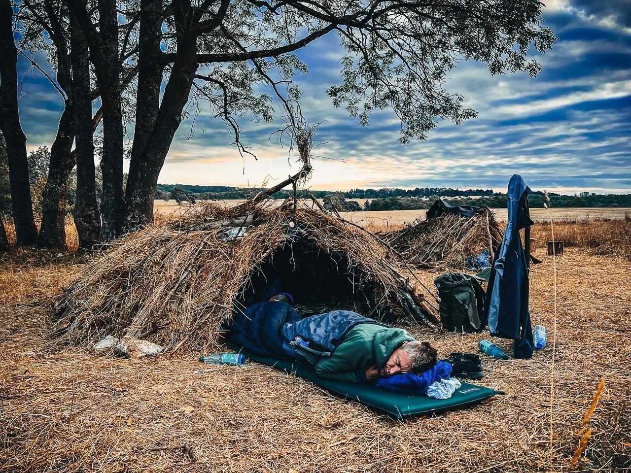 Schlafende Person in einer Laubhütte auf einer Wiese mit Rucksack und Ausrüstung